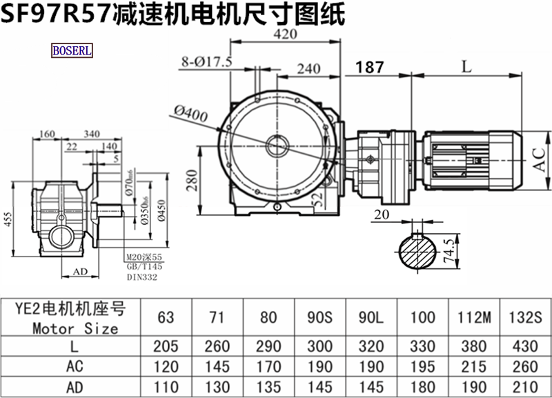 SF97R57減速機外形尺寸:輸出軸尺寸Φ70+鍵4.5(可定做),高455*寬500(帶輸出軸)*長607
